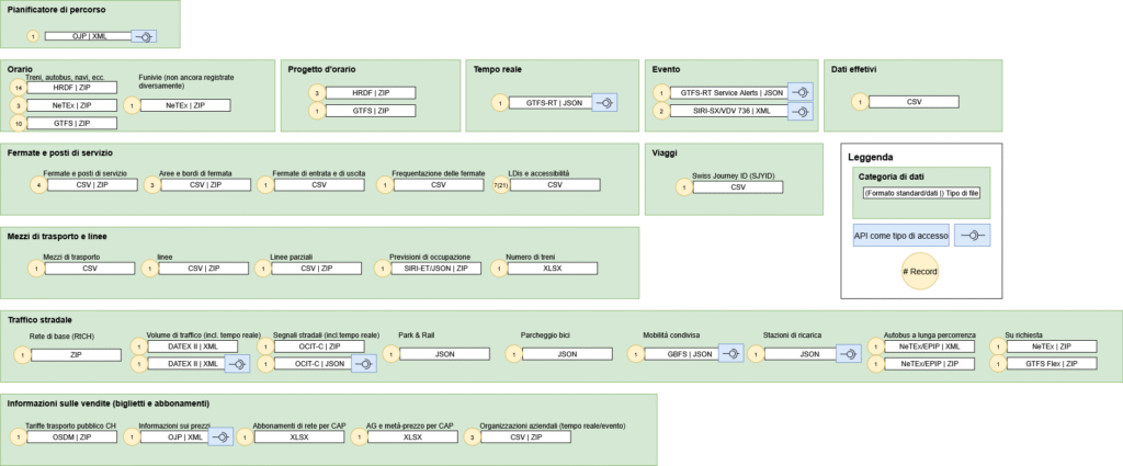 - Dati dell’orario – Panoramica: Grandi record di dati (HRDF, GTFS, NeTEx) con le informazioni aggiornate sull’orario di tutti i TP svizzeri e le offerte nuove/alternative (funivie, autobus a lunga percorrenza ecc.).